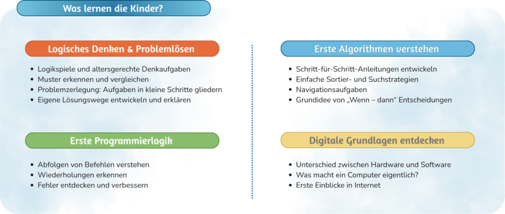 Im Mittelpunkt steht nicht das Bedienen von Geräten, sondern das Entwickeln eigener Lösungsstrategien. Die Kinder lernen spielerisch wie man komplexe Probleme lösen kann, indem man sie in einzelne Schritte zerlegt und strukturiert angeht. Dadurch üben sie, genau hinzusehen, geduldig zu überlegen und ihre Gedanken nachvollziehbar zu erklären. Das sind wichtige Fähigkeiten, die sie in Schule und Alltag stärken.