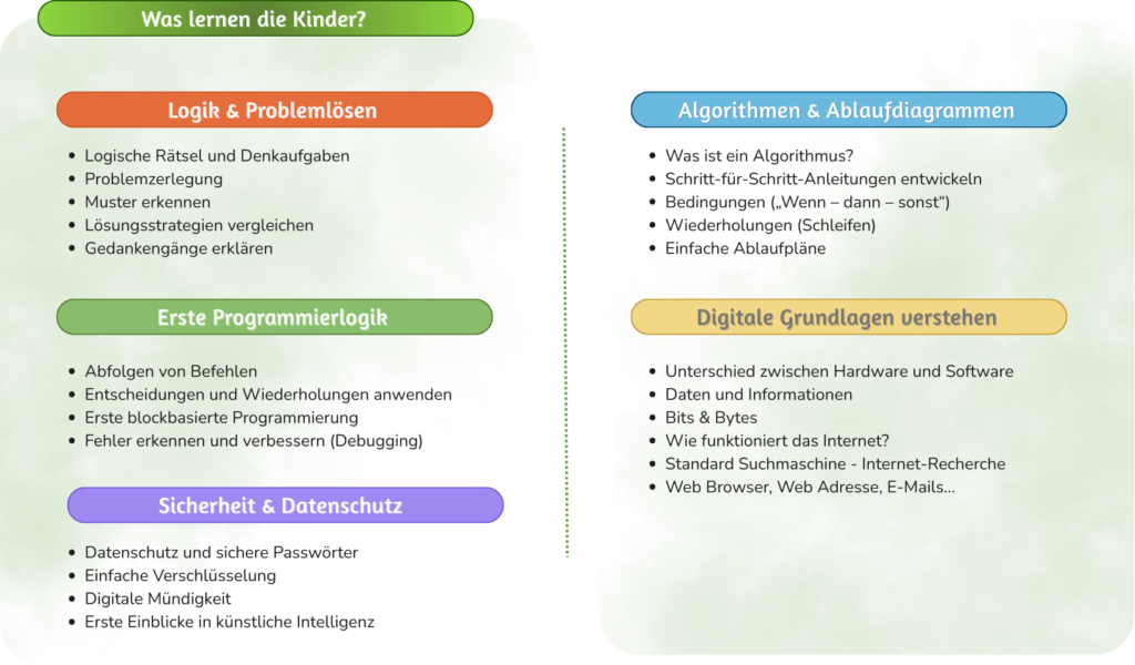 Jeder Termin beinhaltet 4 Unterrichtseinheiten (1 UE = 50 Minuten) und verbindet logisches Denken, algorithmische Grundlagen und digitale Bildung in altersgerechter Form.